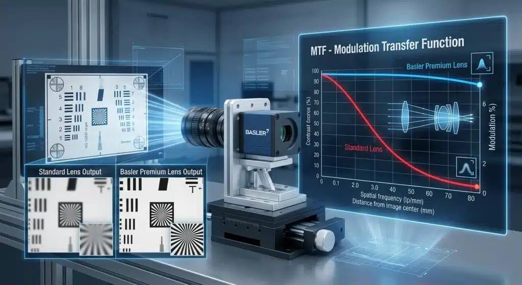 در لنزهای استاندارد بازار، کیفیت در مرکز خوب است اما در لبهها افت شدیدی دارد. اما لنزهای سری Premium باسلر به گونهای طراحی شدهاند که خطوط MTF آنها حتی در گوشههای تصویر هم در بالاترین سطح باقی میماند. این یعنی شما تصویری یکدست، واضح و بینقص دریافت میکنید که برای نرمافزارهای پردازش تصویر (Image Processing) یک رویای به حقیقت پیوسته است!